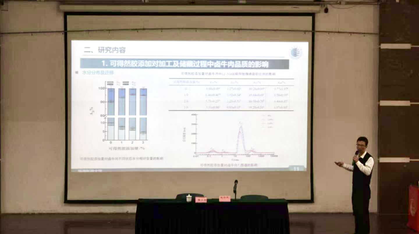 报告中,曹云刚教授系统阐述了团队在可得然胶应用于卤牛肉品质提升方面的研究成果。研究采用“内外兼修”策略:对内以2%可得然胶提升卤牛肉嫩度与保水性,改善冻融稳定性;对外开发可得然胶基保鲜膜,通过添加多聚赖氨酸和花青素实现抑菌护色。2.5%添加量可使膜性能最优。互动环节中,曹教授肯定该技术在果蔬涂膜保鲜领域同样具有应用前景。