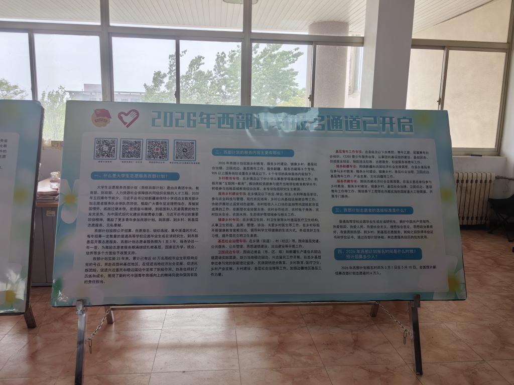 按照统一要求,在教学楼大厅、走廊公告栏等区域规范张贴西部计划宣传素材,让“到西部去”的理念入眼入心。同时组建政策宣讲队伍,深入班级开展全覆盖宣讲,围绕报名流程、考研加分、待遇保障等学生关心的问题进行细致解读,并邀请往届优秀志愿者返校分享基层服务经历,激发学子投身西部的热情。此外,建立西部计划专项工作群,安排专职辅导员全天候在线解答报名操作、岗位分配等高频问题,打通政策咨询“最后一公里”。在此基础上,我院同步开展志愿意向摸排,精准掌握学生报名动态。